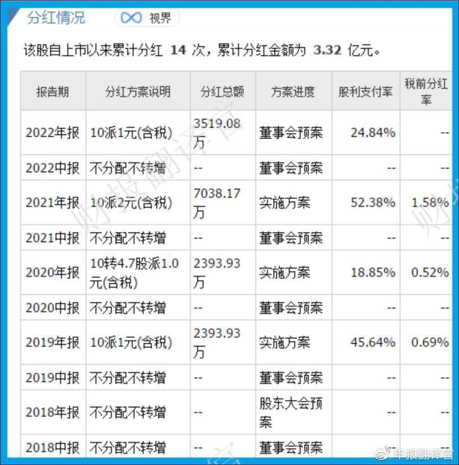 而在家公司的分红信息中翻译官还得知,该企业自上市以来累计分红14次,总共派发现金3.32亿元。