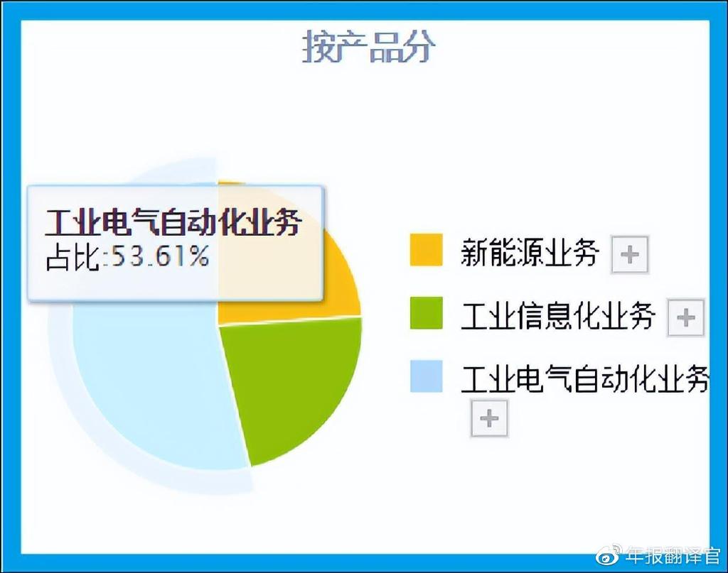 这家公司工业电气自动化业务的收入占比为53.61%,新能源业务的收入占比为23.98%,工业信息化业务的收入占比为22.41%。