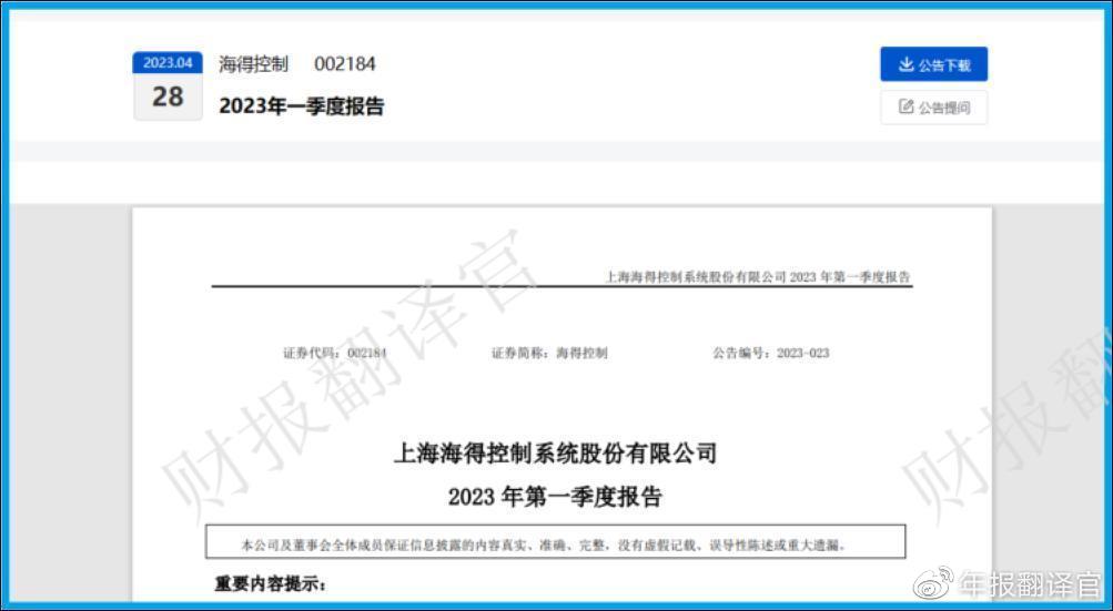 大家好我是财报翻译官,今天将调研A股软件概念板块中,海德控制(股票代码:002184)这家上市公司2023年第一季度财报,下面进入今天的主题。