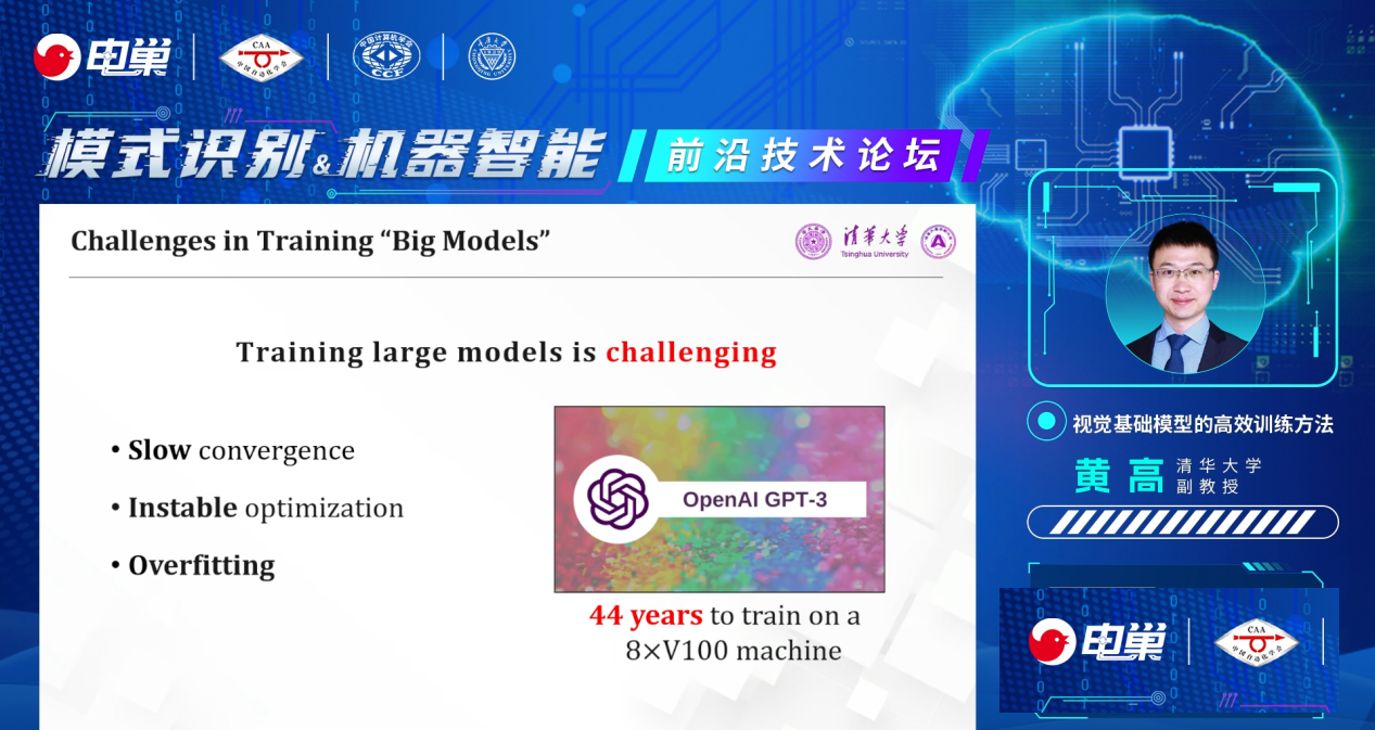 最后一场分享由清华大学自动化系副教授,博士生导师黄高博士出席。黄博士表示,近年来,大规模通用视觉模型在计算机视觉领域获得广泛关注。然而模型深度和参数的迅速增加造成了训练时间长、显存开销大、容易过拟合等挑战。