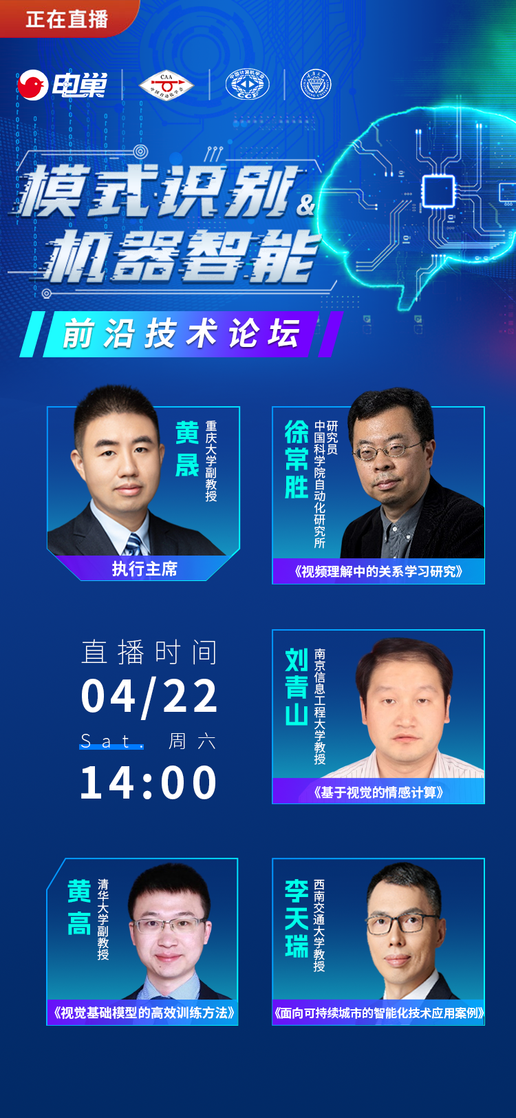 4月22日,为了促进模式识别、数据挖掘和计算机视觉等相关领域从业者进一步了解领域内最新发展动态与前沿技术进展,由中国自动化学会主办,中国自动化学会模式识别与机器智能(CAA-PRMI)专委会、中国计算机学会(CCF)重庆会员活动中心和重庆大学大数据与软件学院联合承办了“模式识别与机器智能”前沿技术论坛,电巢直播担任本次论坛的独家直播平台,为大家呈现了一场高质量的科普盛宴。