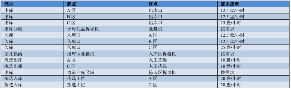 间隔72秒出库一盘原料,按照每个巷道均匀分配的出库原则出库,折算到每个区域的流量为:A区域供给12.5托盘到出库口,B区域供给12.5托盘到出库口,C区域供给25托盘到出库口。