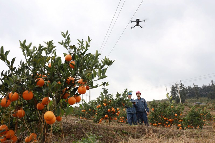 工作人员用无人机对农业生产相关供电线路开展精细化巡检。