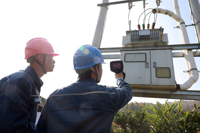 工作人员对变压器进行测温。