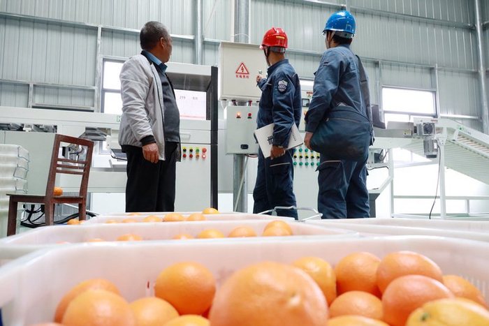 眼下正值脐橙采收加工旺季,贵州省黔西南布依族苗族自治州晴隆县鸡场镇柑橘加工厂房内,全自动化选果生产线高速运转。色泽鲜亮的脐橙依次完成清洗、烘干、分级等工序,几名工作人员在设备旁有序装箱,一箱箱优质脐橙即将发往全国各地市场。