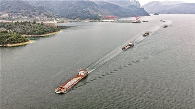 图为12月16日,货船从瓮安港云中港区启运出发(无人机照片)。